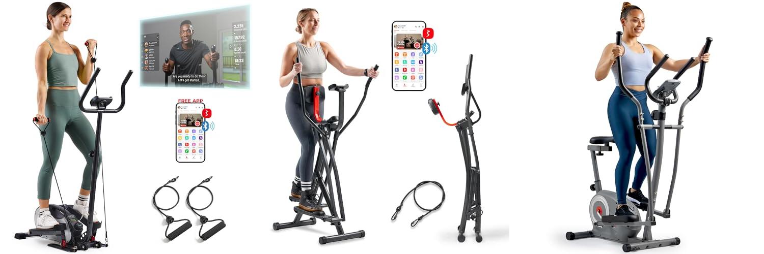 1. Sunny Health & Fitness Smart Compact Elliptical Cross Trainer with Handlebar and Exercise Bands