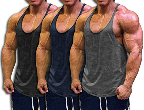 4. ZUEVI Men’s 3 Pack Muscular Tanks Bodybuilding Gym Vest Stringer Y-Back Tank Tops Workout Fitness T-Shirt (Black&White&Gray-L)