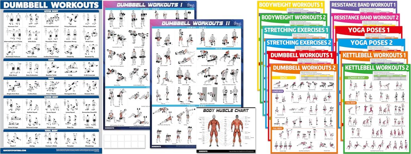 - Complete Home Gym Kit: This set includes two workout posters, a helpful chart showing your body’s muscles, and double-sided tape to hang them up easily. It’s everything you need to start your home dumbbell training.