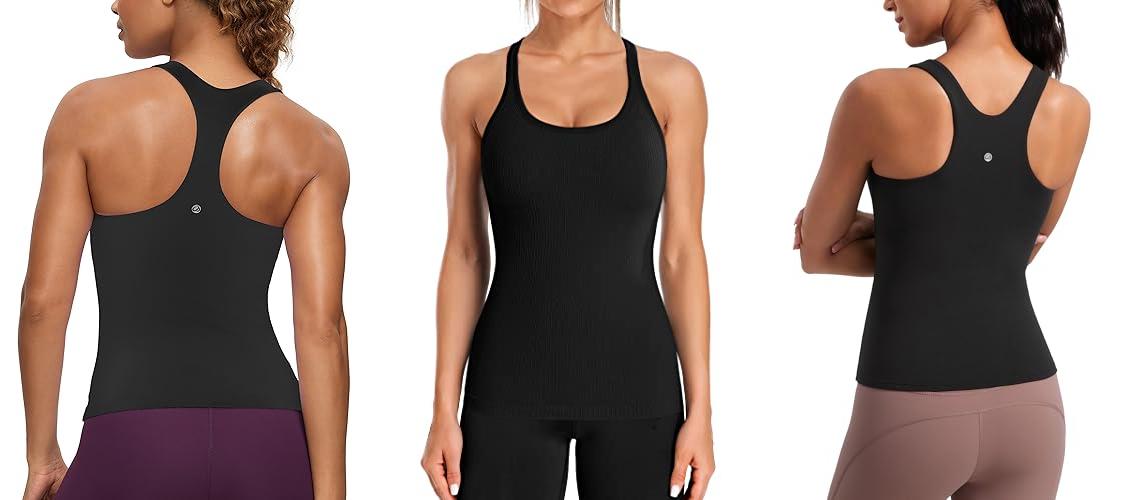 1. CRZ YOGA Butterluxe Workout Tank Tops for Women Built in Bras Padded – Racerback Athletic Spandex Yoga Camisole Black Medium